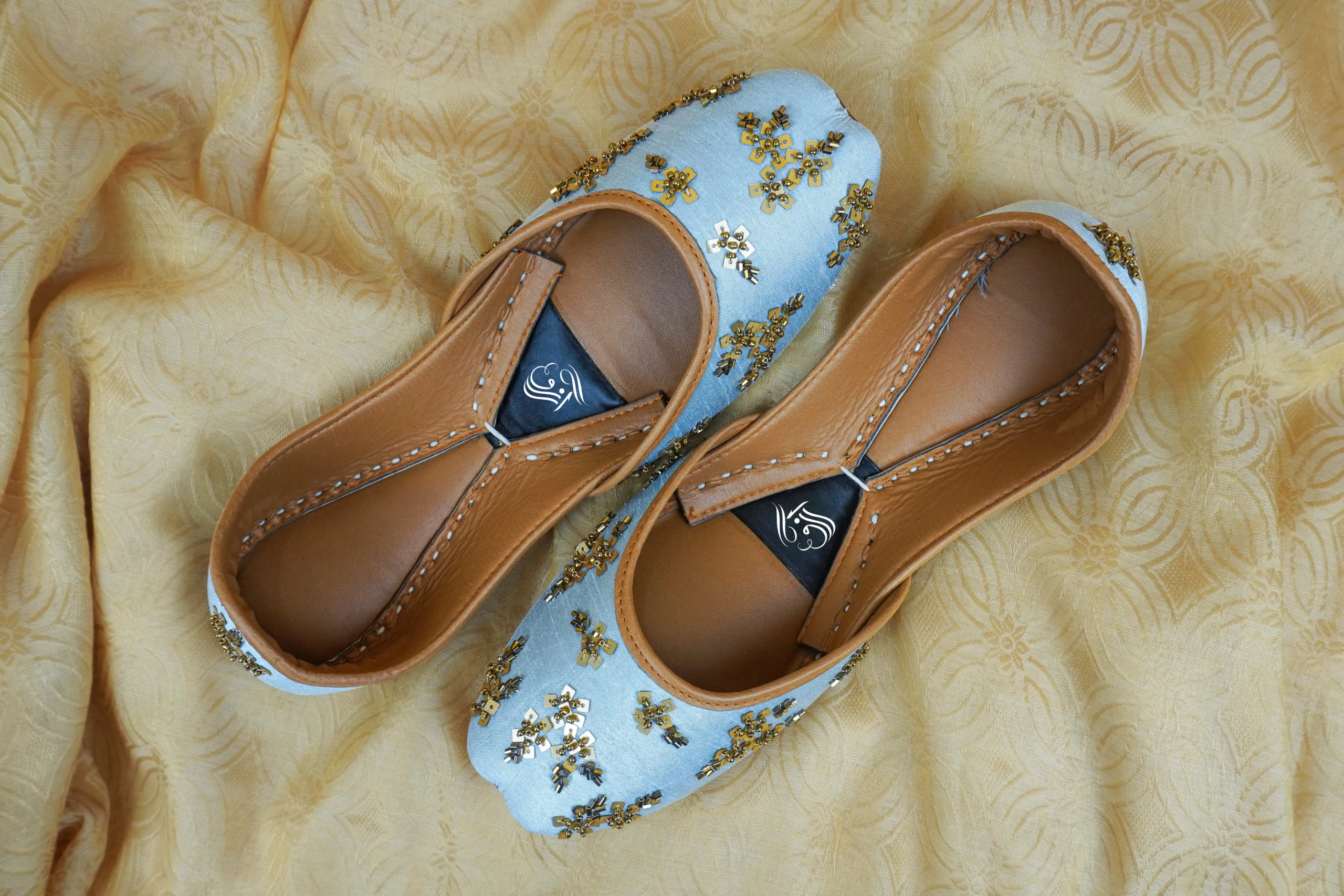 These exquisite handcrafted khussa shoes embody a perfect balance of traditional charm and refined artistry. Designed on an elegant off-white base, each pair is meticulously adorned with intricate golden embroidery and delicate beadwork, creating a luxurious and graceful look. The soft tan leather lining provides exceptional comfort, while the carefully stitched sole ensures durability for long-lasting wear. Versatile and stylish, these khussas complement traditional outfits like shalwar kameez and lehengas just as beautifully as they enhance modern attire with an added touch of ethnic sophistication.