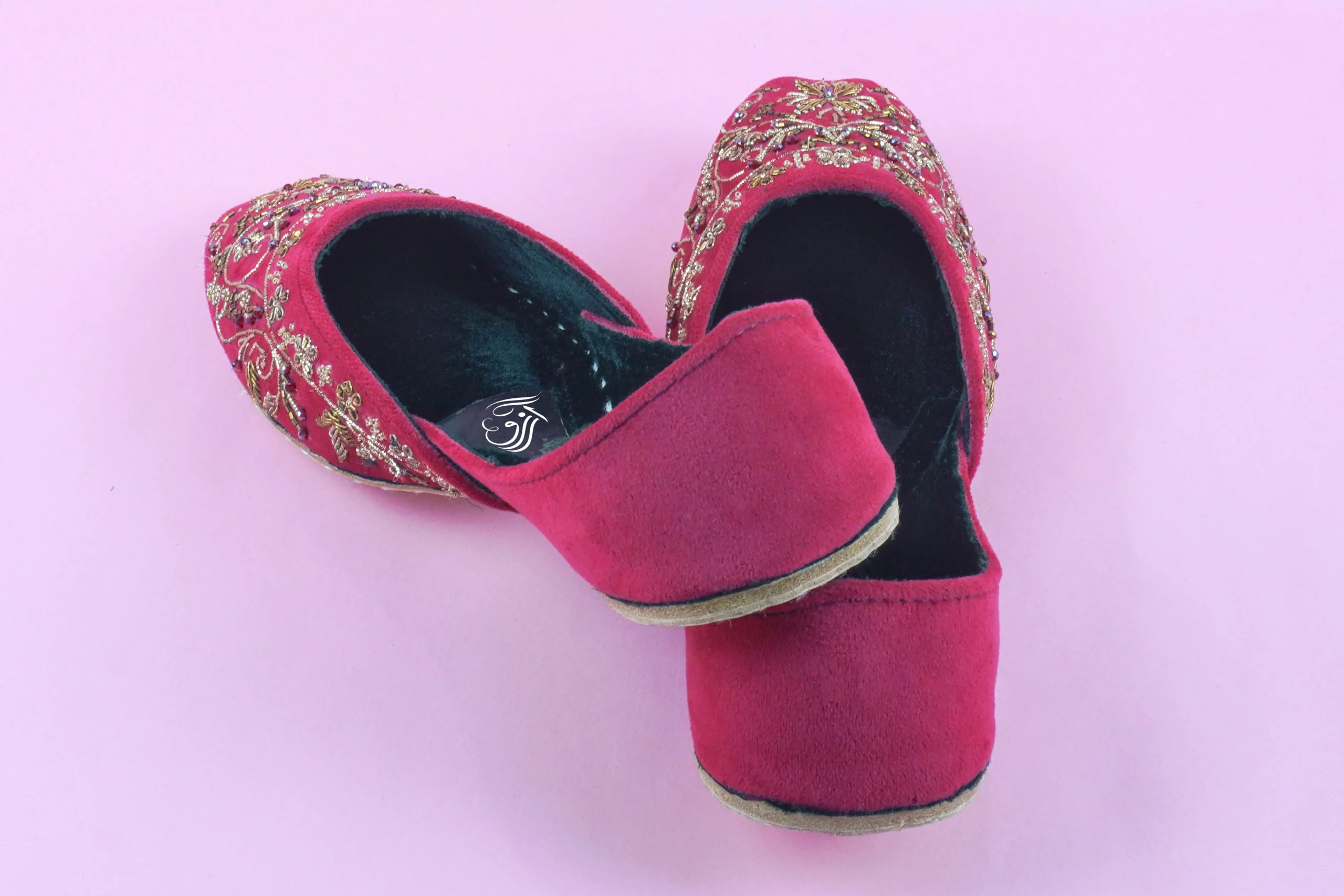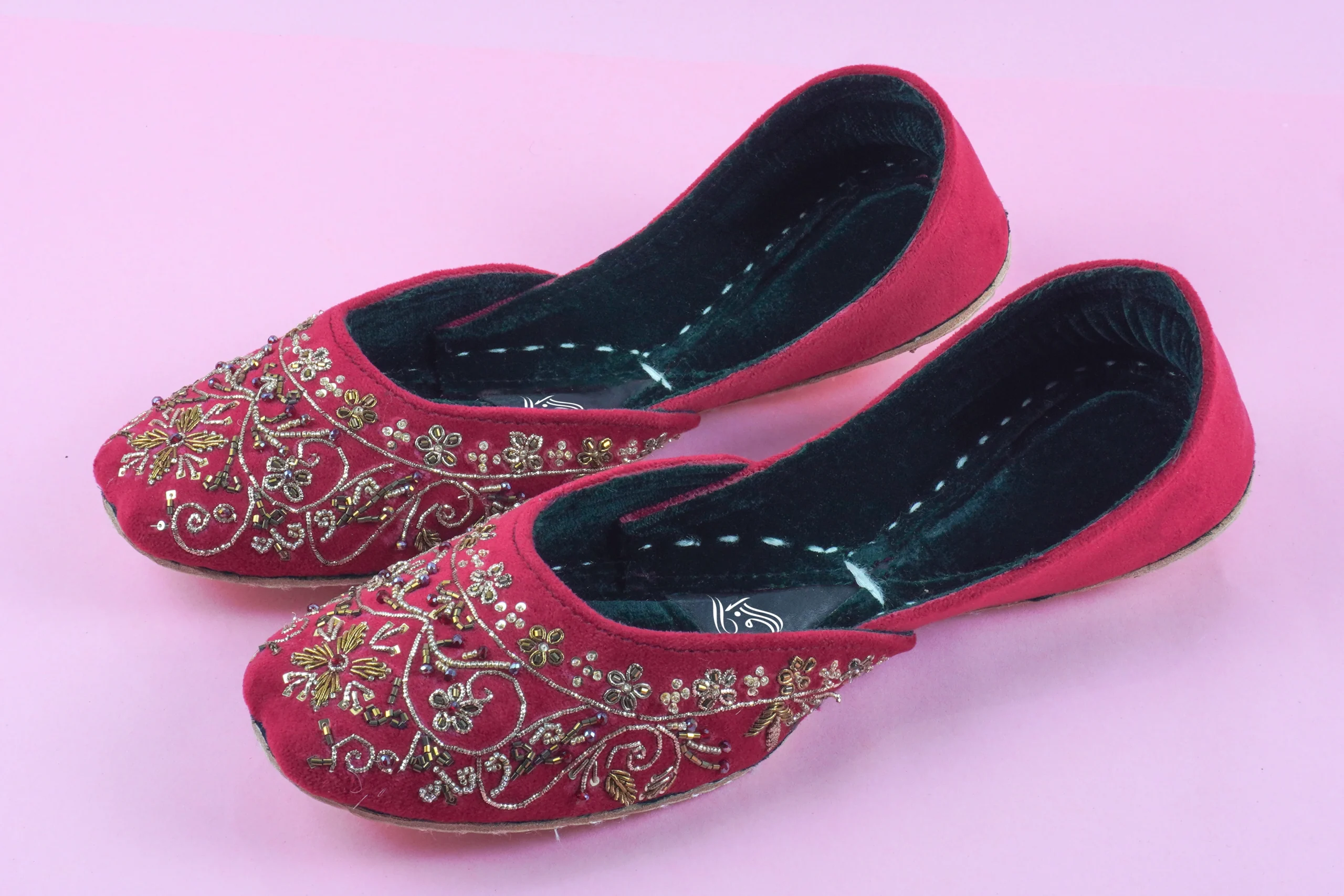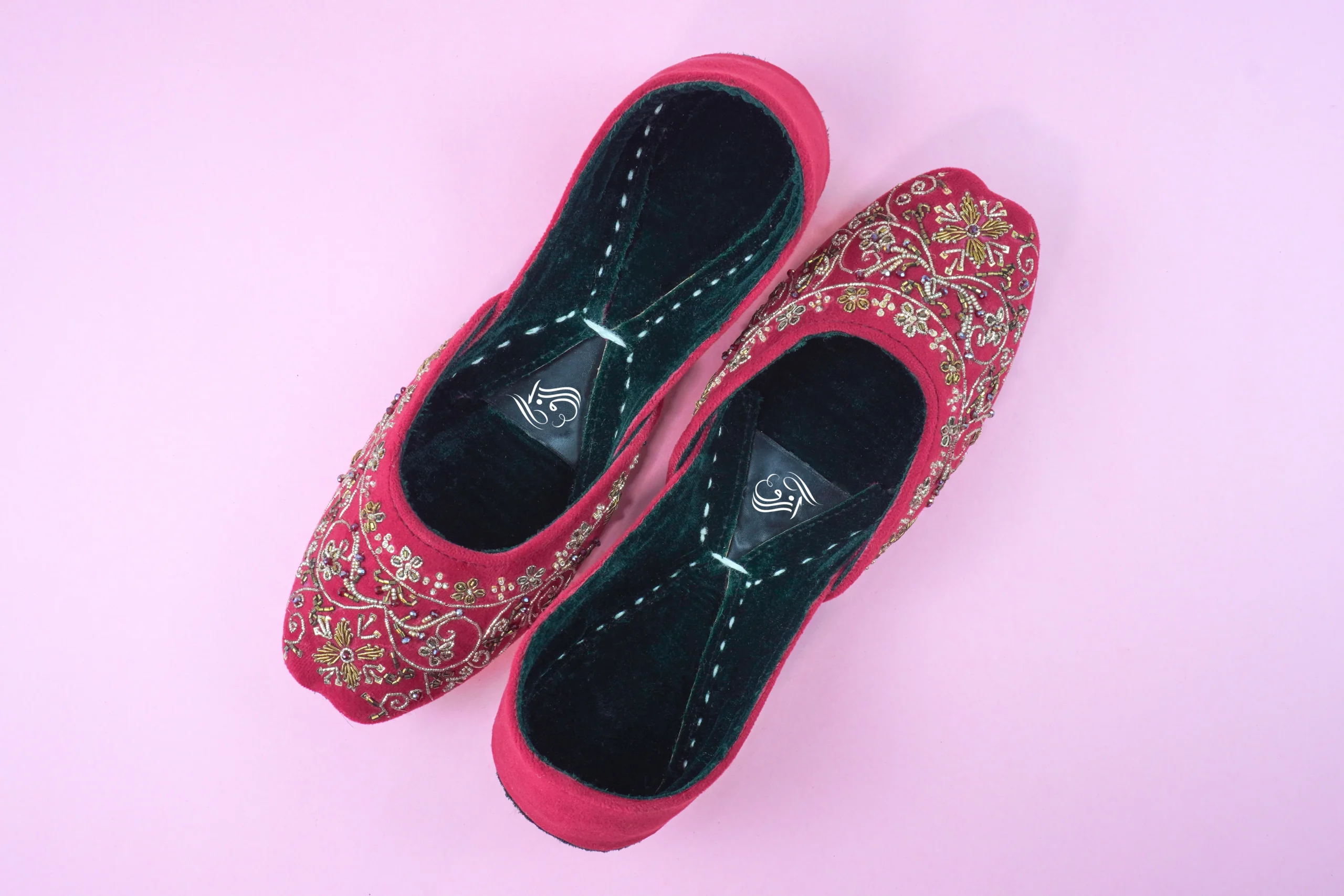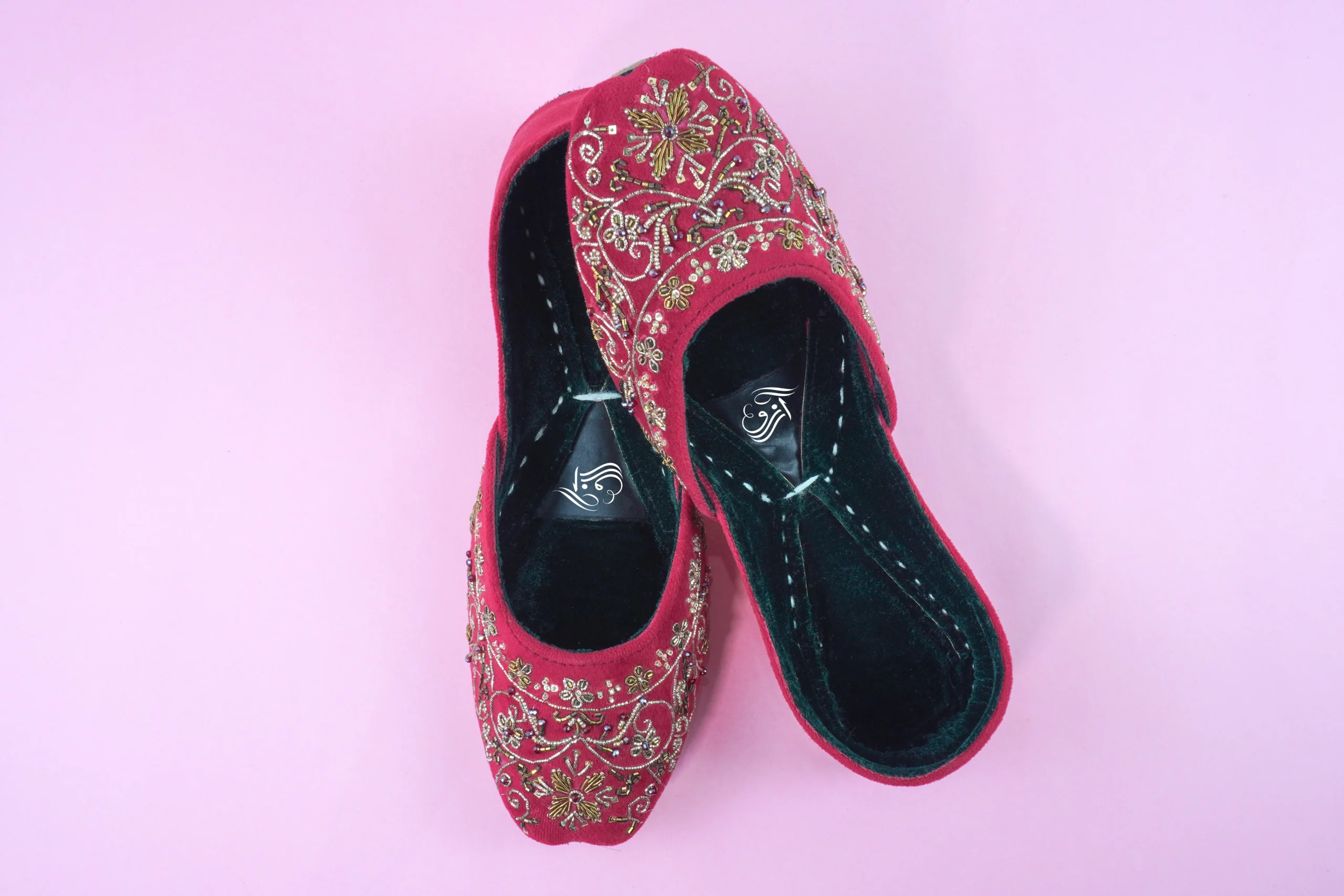 These exquisite handcrafted Khussa shoes feature a rich deep pink-red velvet base, beautifully adorned with intricate golden zari and bead embroidery. The delicate floral and vine motifs add a regal charm, making them an ideal choice for weddings, festive celebrations, and cultural events. Designed with a soft inner lining for lasting comfort and a flat sole for effortless wear, these khussas perfectly combine traditional elegance with contemporary style.