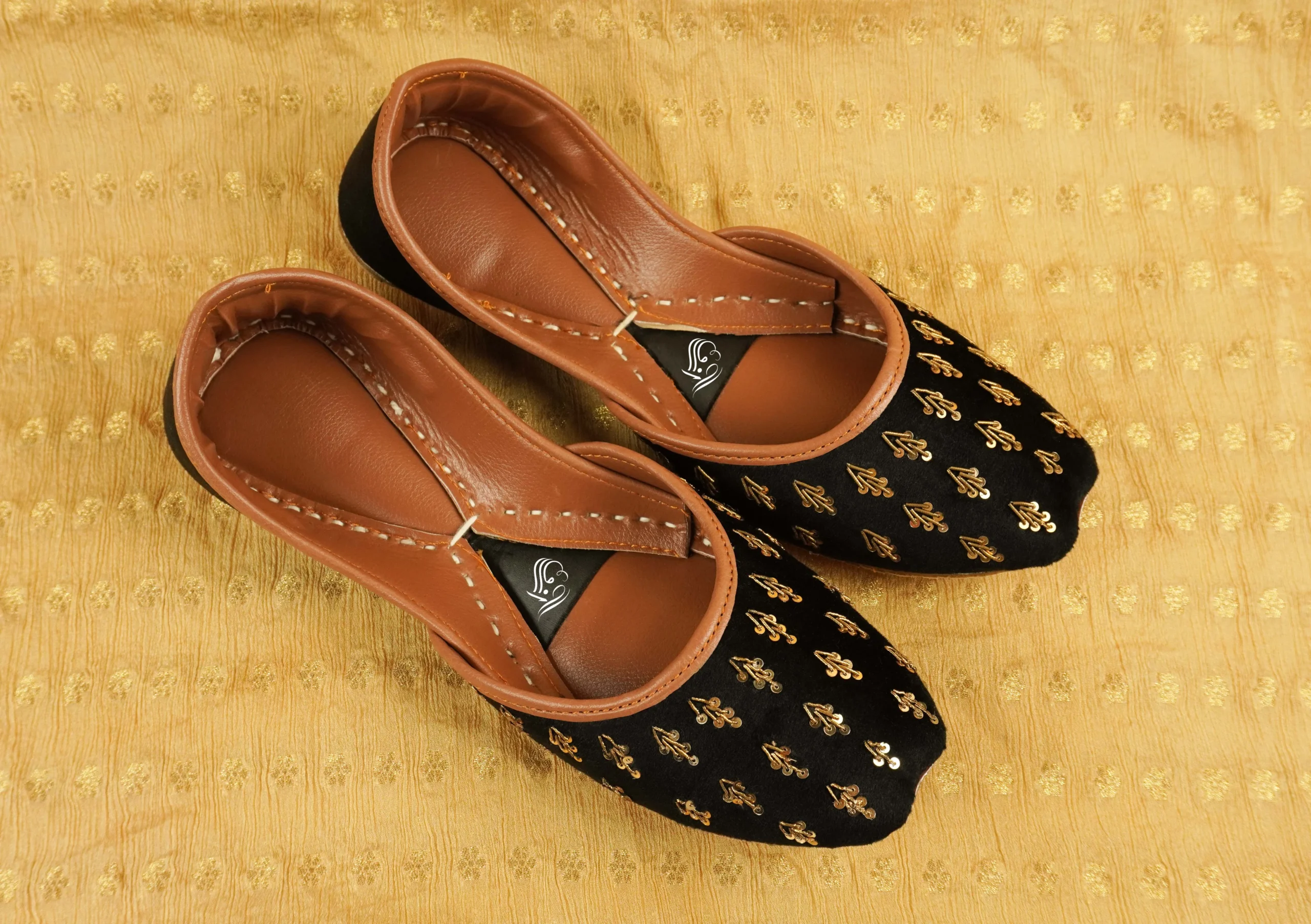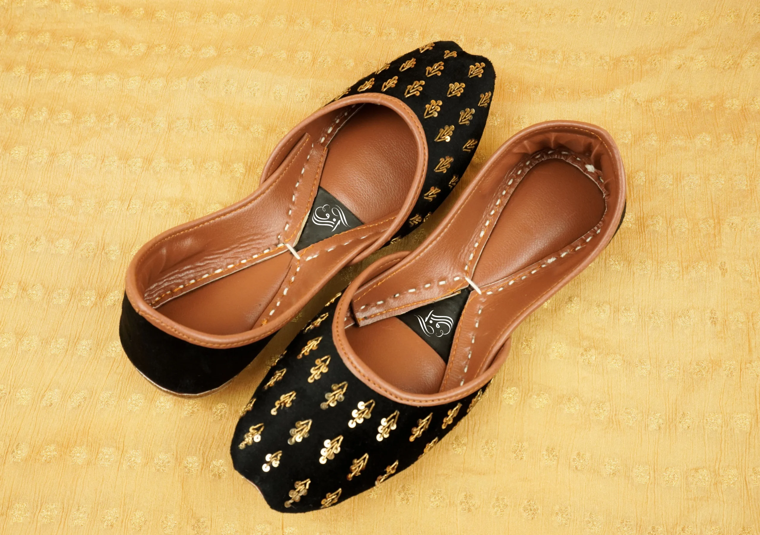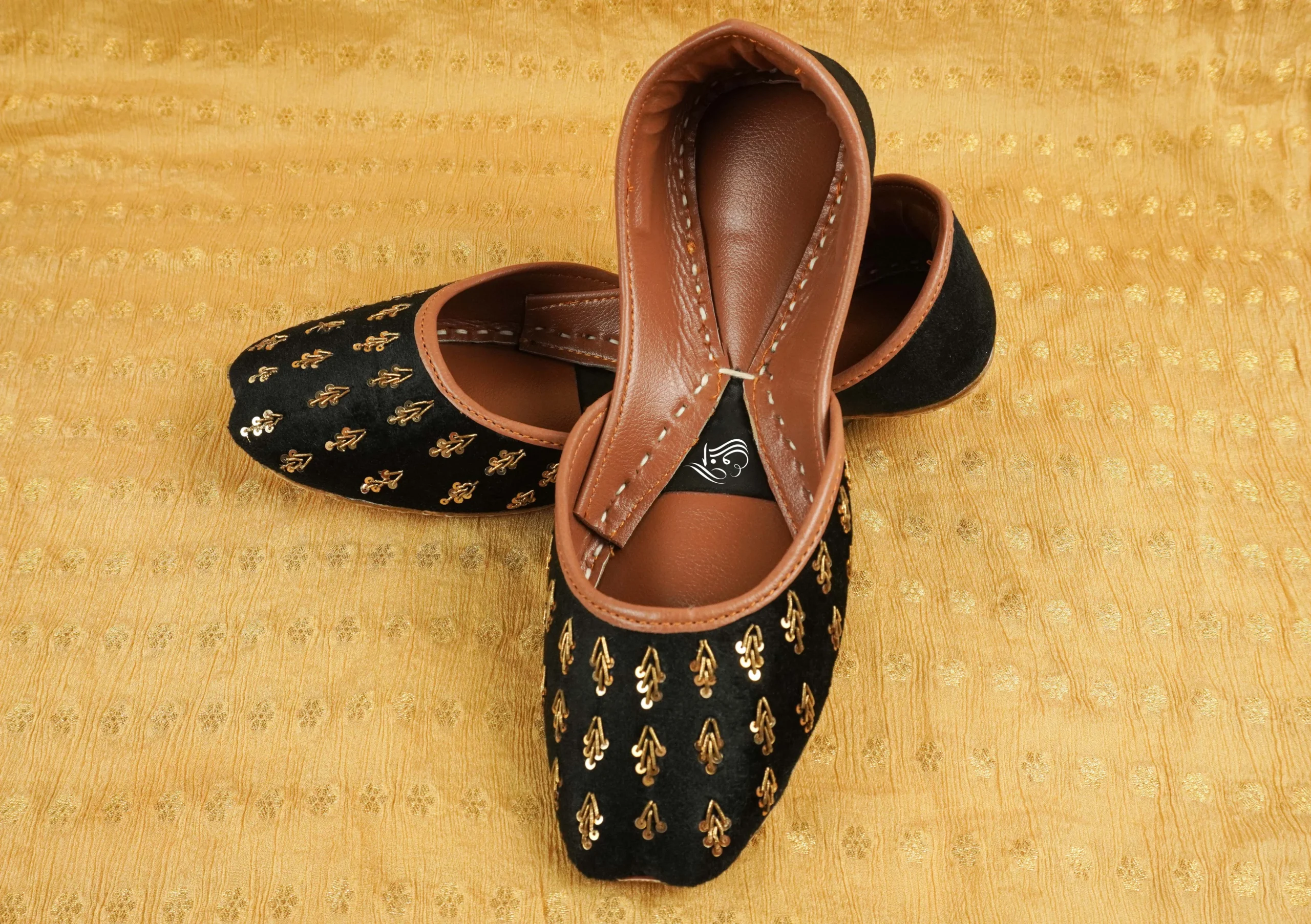 Experience pure elegance with this Black Velvet Golden Embroidered Khussa — a masterpiece of traditional craftsmanship and modern style. Handcrafted with care, it features a rich black velvet base embellished with intricate golden embroidery that radiates royal sophistication. The soft leather lining provides lasting comfort, making it perfect for weddings, festive events, and cultural celebrations. Blending timeless artistry with contemporary flair, this khussa adds a graceful touch to any outfit and is an essential addition to your ethnic wardrobe.