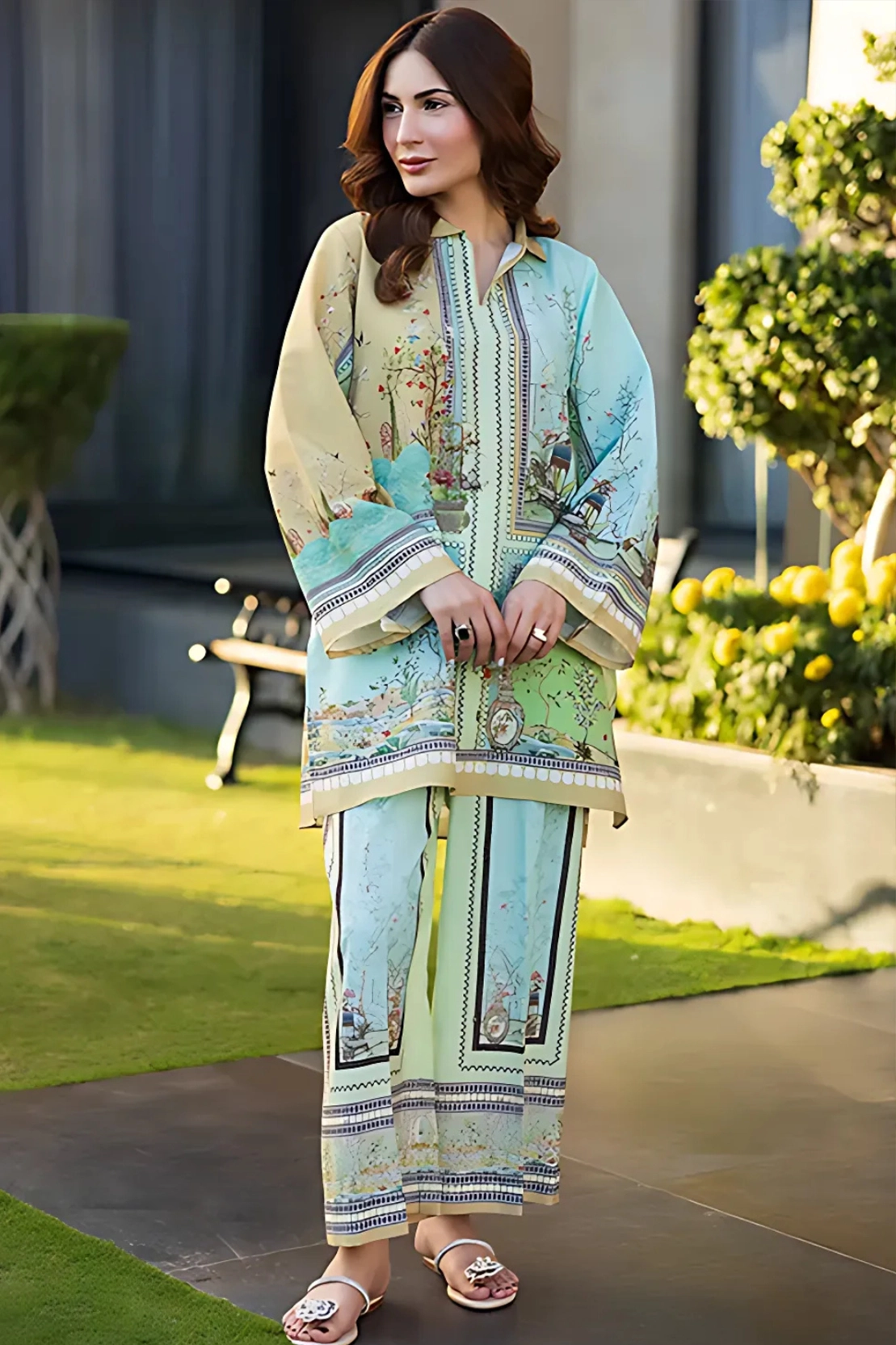 A refreshing mint-toned co-ord set adorned with delicate botanical and architectural prints in soft pastels. The fluid silhouette and intricate borders evoke a dreamy, vintage charm, making it an effortless choice for warm-weather sophistication.