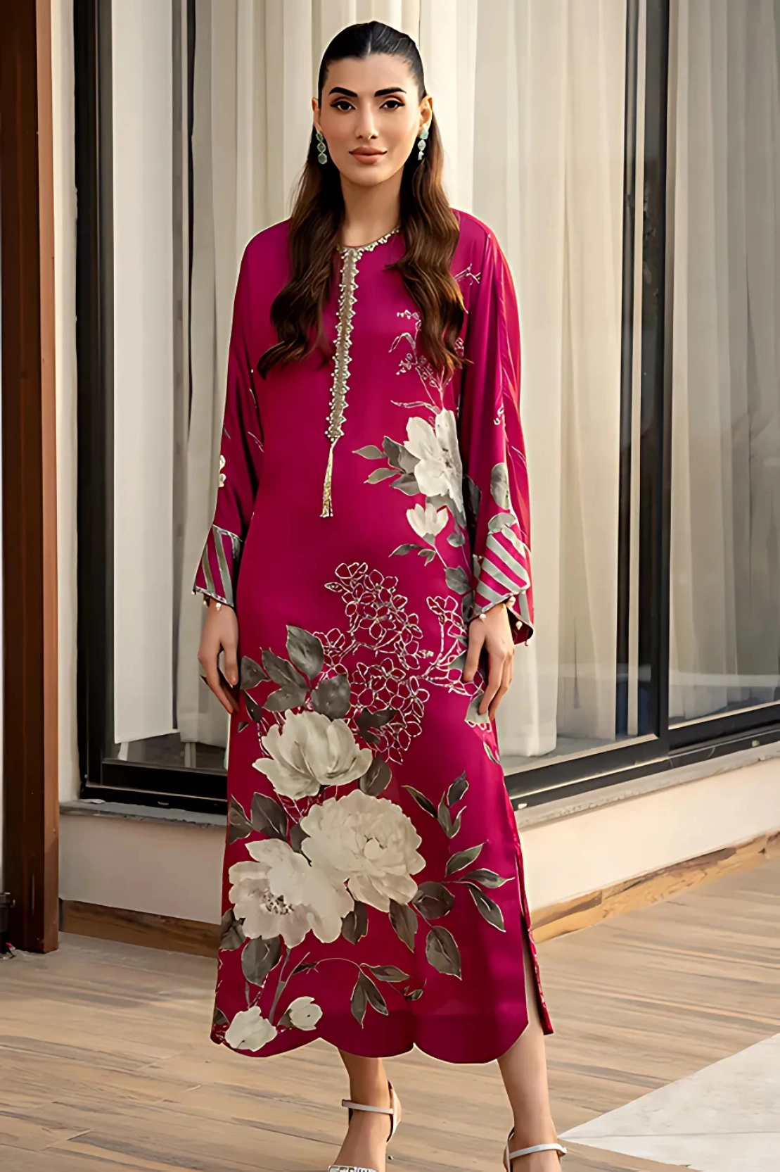 This dress made in soft charmeuse silk fabric, in floral print, features crew neckline with hook & eye closure along the back, crystal embellishment along the neckline and front with a crystal tassel hanging, kimono sleeves with crystal hangings, scallop detail along the hem and side slits.