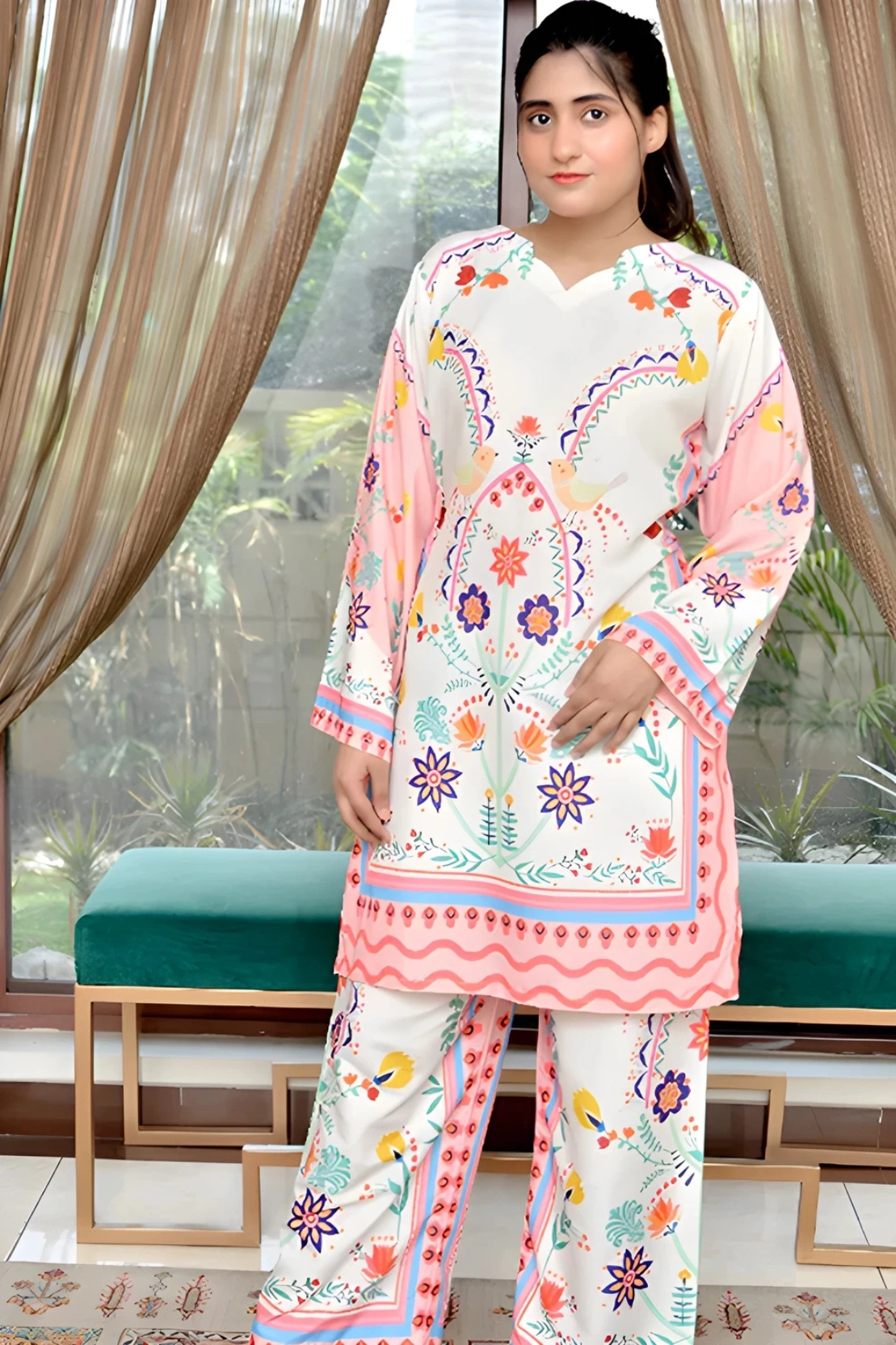The suit is designed in a white base fabric with vibrant multicolored floral and geometric prints. The shirt features a straight cut with full sleeves, decorated with symmetrical motifs in pink, orange, blue, and green tones. The neckline is a simple V-cut style, keeping the look elegant and minimal. The trousers are loose-fit, printed with matching motifs and bordered with a pink patterned edge. She completes the look with transparent embellished heels, adding a touch of modern style. The background is a home interior with curtains, a window, and a decorative carpet, enhancing the traditional yet contemporary vibe.