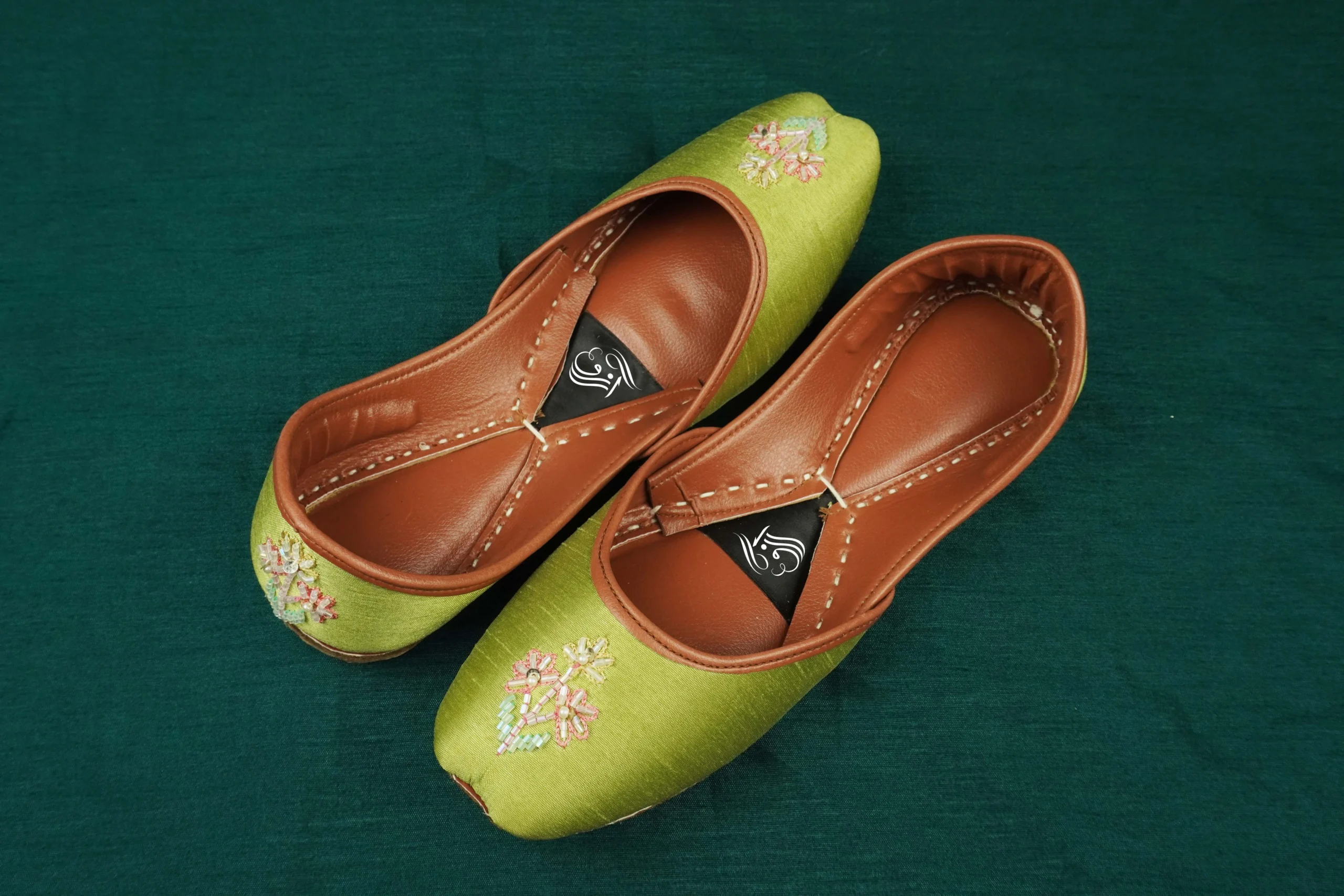 These traditional handcrafted khussa shoes beautifully blend elegance with comfort. Featuring a lively green fabric base adorned with delicate floral embroidery and complemented by a rich tan leather inner lining, they exude timeless charm and cultural grace.