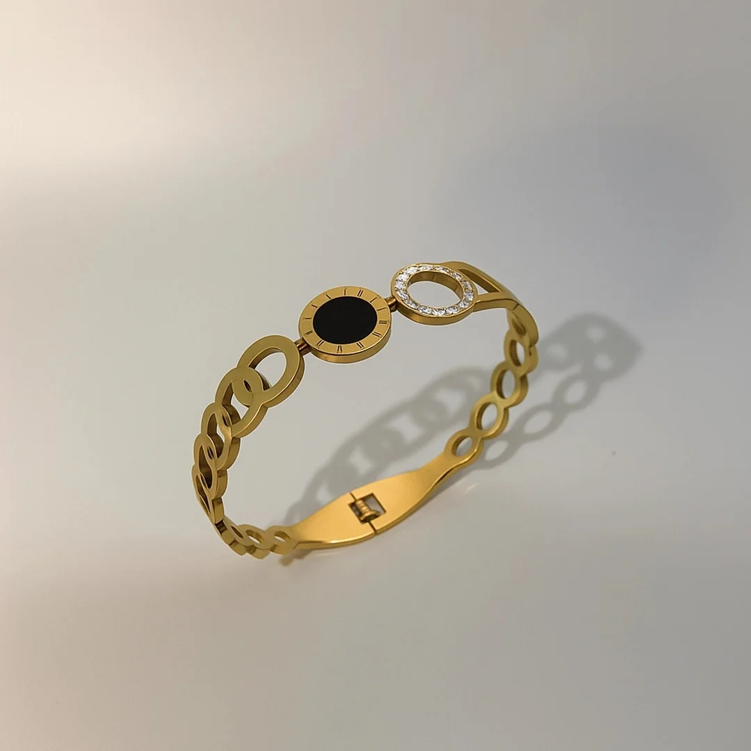 A stylish gold-plated bracelet designed with a modern circular pattern. One circle is adorned with sparkling cubic zirconia stones, while the other features a sleek black enamel finish. The minimalist yet elegant design makes it perfect for both casual and formal looks.