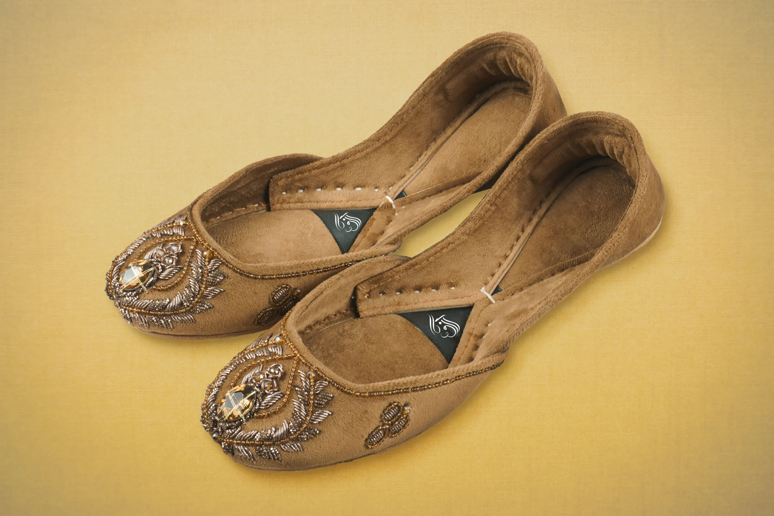 Embrace tradition with a touch of elegance in the Heritage Charm Brown Suede Khussa. Adorned with intricate gold and bronze embroidery, this pair celebrates the artistry of Pakistani craftsmanship. The soft suede exterior offers a luxurious feel while ensuring exceptional comfort for all-day wear.