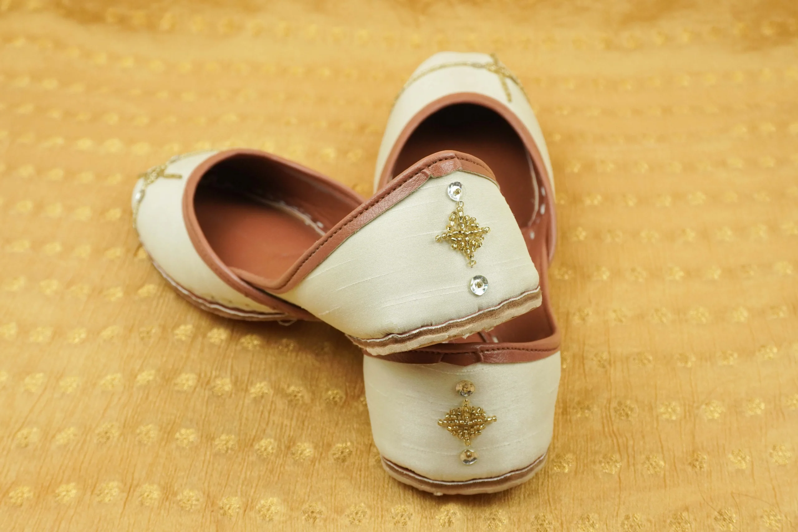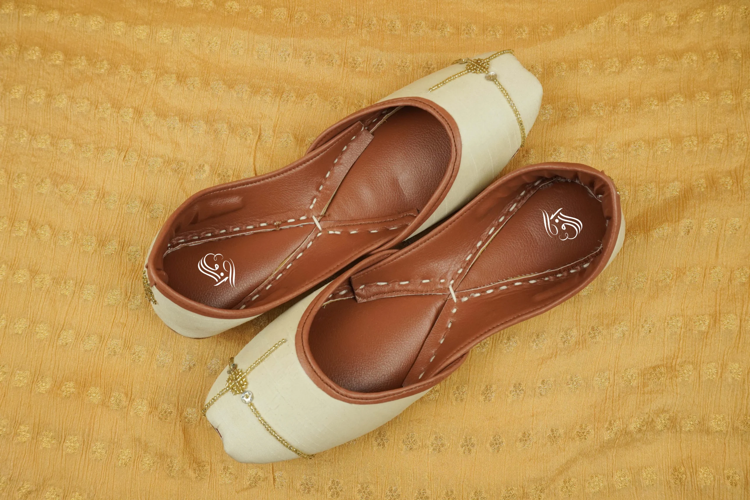 Infuse your style with timeless charm through the Ivory Elegance Khussa. Crafted on a graceful ivory base and embellished with delicate golden beads and subtle crystal accents, this exquisite pair beautifully balances tradition with luxury. Meticulously handcrafted by skilled artisans, it features a smooth fabric exterior complemented by a genuine leather lining for ultimate comfort and durability. Perfect for weddings, festive celebrations, or formal occasions, the Ivory Elegance Khussa adds a regal and sophisticated touch to any ensemble.