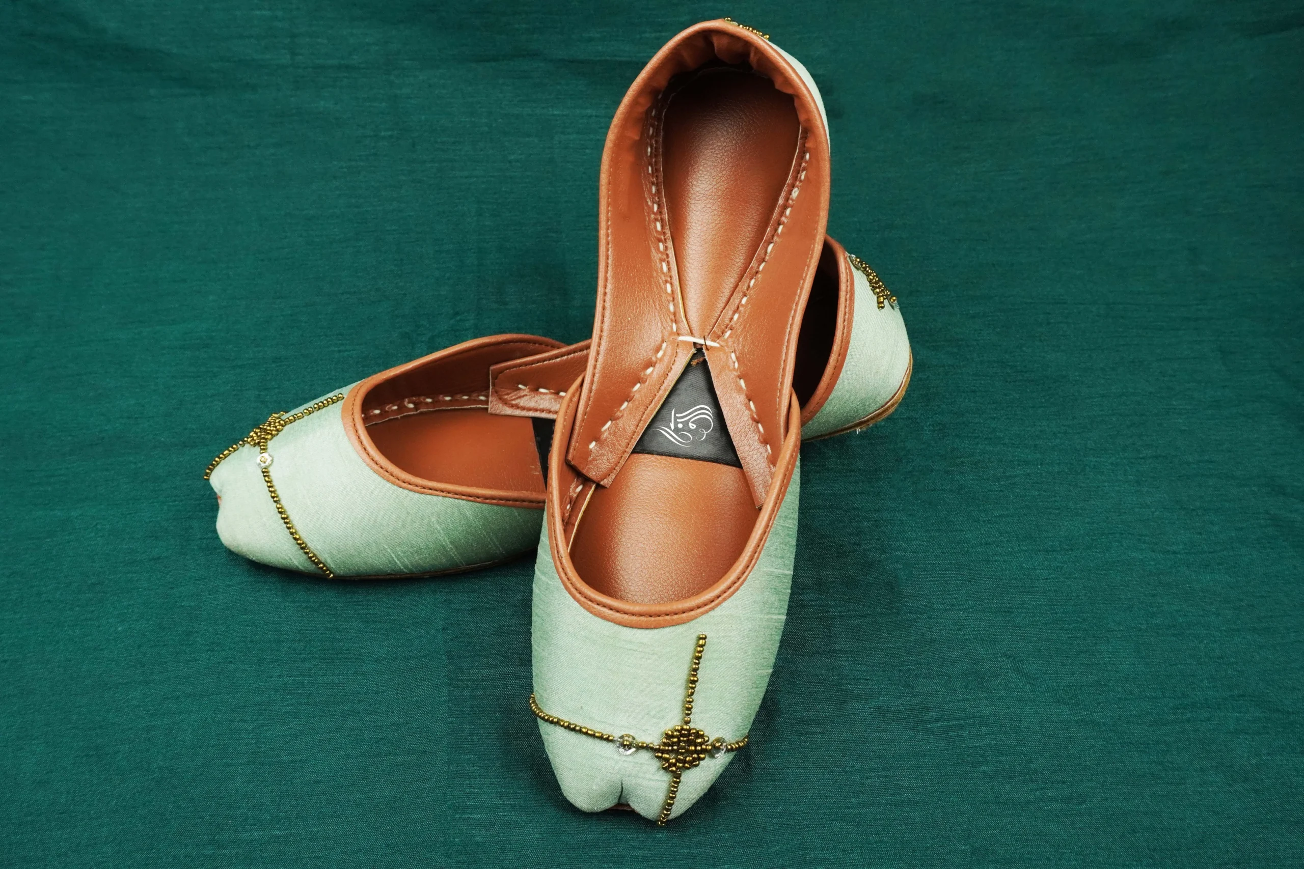 Design: Elegant mint-green handcrafted khussa adorned with delicate golden bead embellishments.