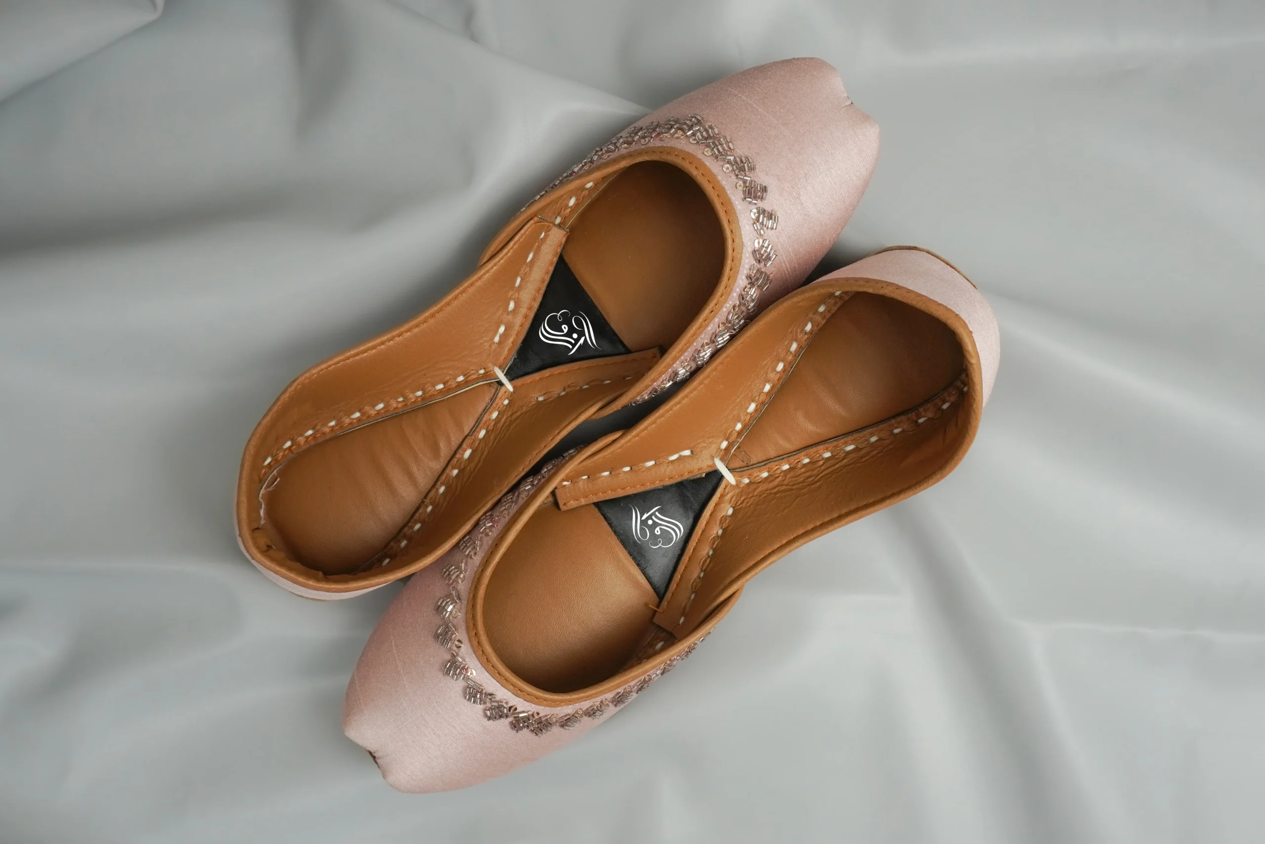 • Elegant pastel pink khussa adorned with subtle, refined embellishments